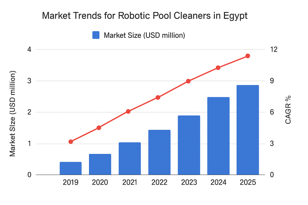 Market research projects and industry data support a pattern of double-digit percentage growth for robotic pool cleaners in the Middle East and North Africa region through the late 2020s — Egypt is well positioned to match regional growth given its tourism recovery and construction pipeline. Cognitive Market Research+1