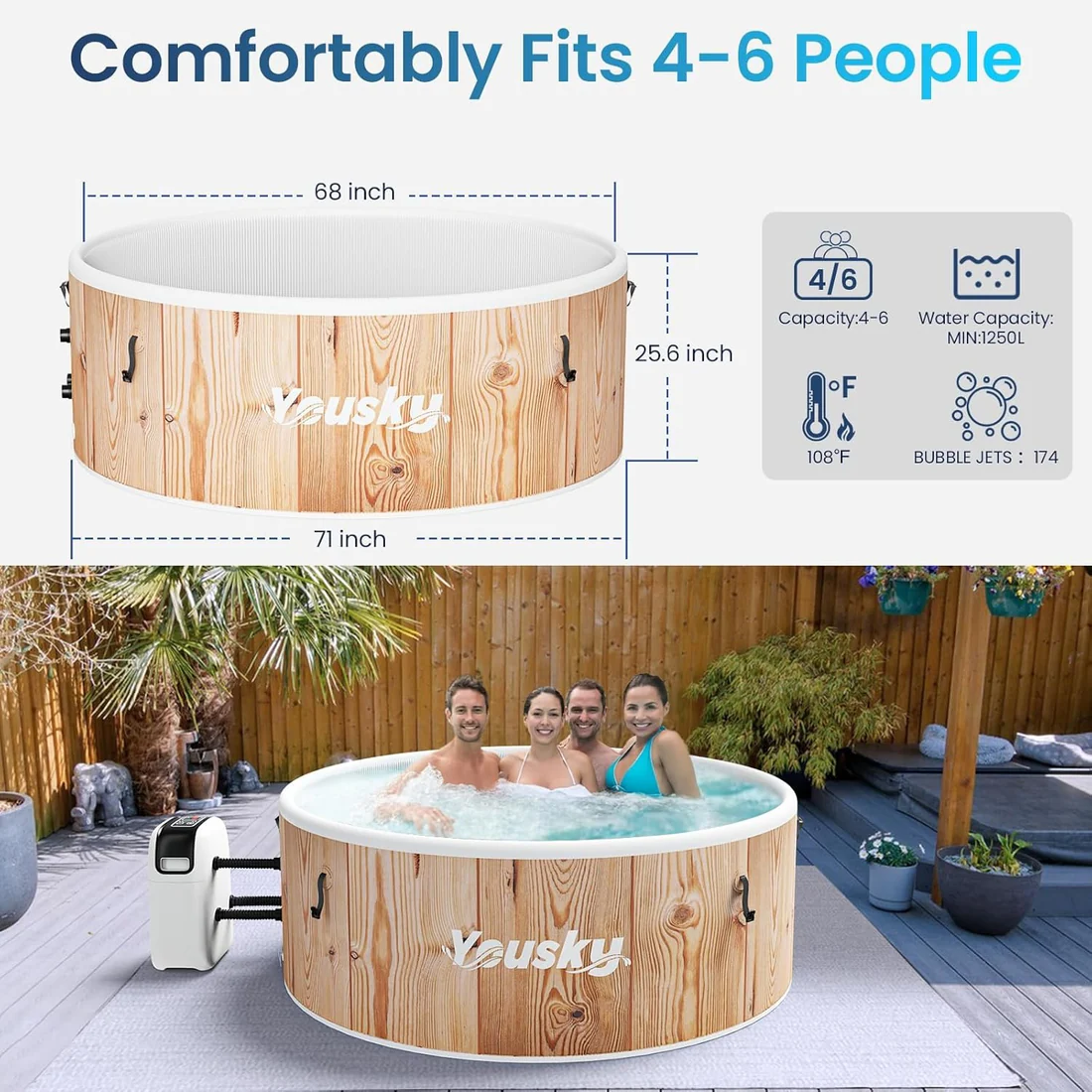 - Регулируемый контроль температуры: Наслаждайтесь успокаивающим купанием при идеальной для вас температуре благодаря регулируемой системе подогрева. Независимо от того, предпочитаете ли вы теплый спа в холодные месяцы или прохладный летом, надувной спа Yousky® обеспечивает идеальную температуру воды для релаксации.